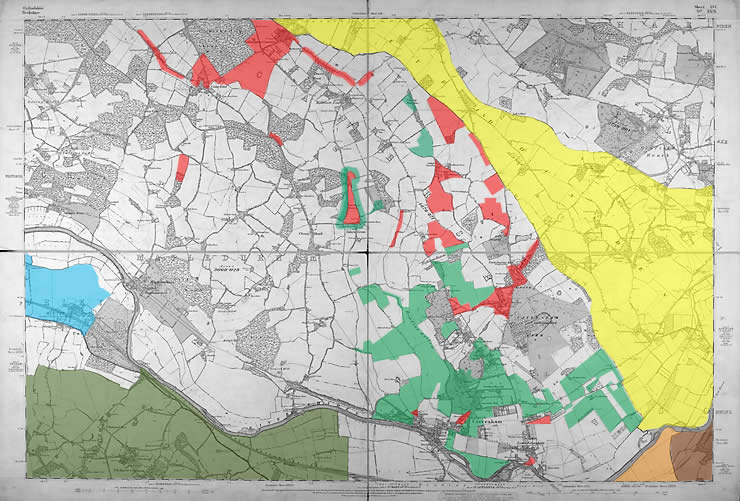 Each OS map has been coloured to show relevant enclosure maps or awards available on this website. Click on a coloured area to find details, and see images of the documents.